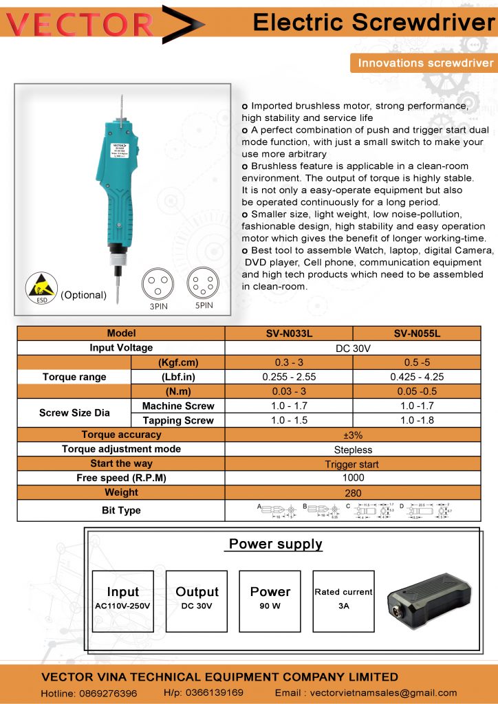 Mã: SV-N033L Danh mục: Tô vít điện, Tô vít điện VECTOR, Vector dòng tô vít điện mới Từ khóa: electric screwdriver, low torque, lực siết nhỏ, máy vặn vít, SV-N033L, tay bắt vít, Tô vít điện, tô vít điện lực siết nhỏ